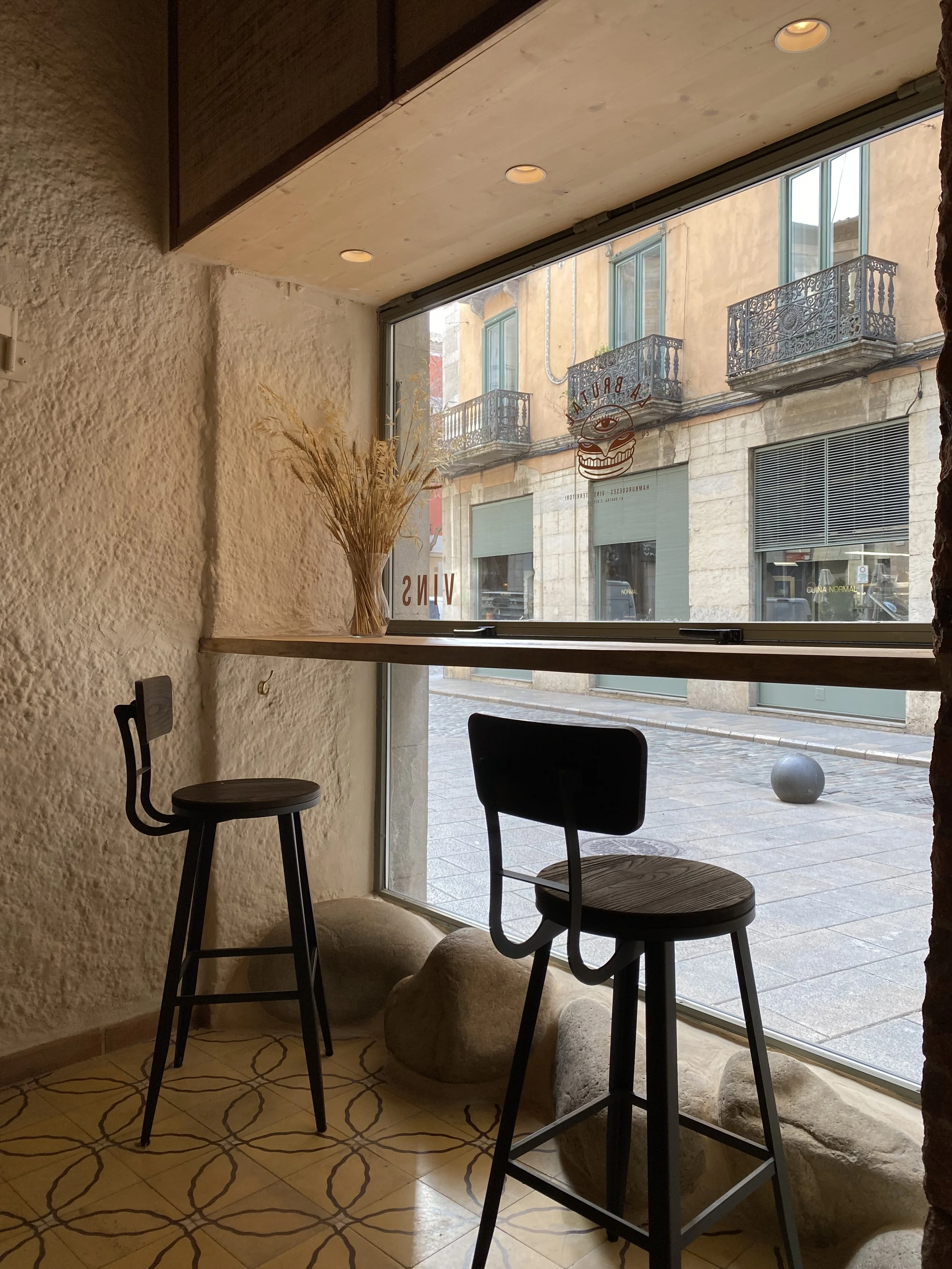 Se utilizaron materiales locales como madera de castaño, azulejos de La Bisbal, baldosas de Quart, antiguos hidráulicos de Banyoles y una barra hecha con bordillos antiguos de la ciudad y auténticos bebederos recuperados en los baños.
